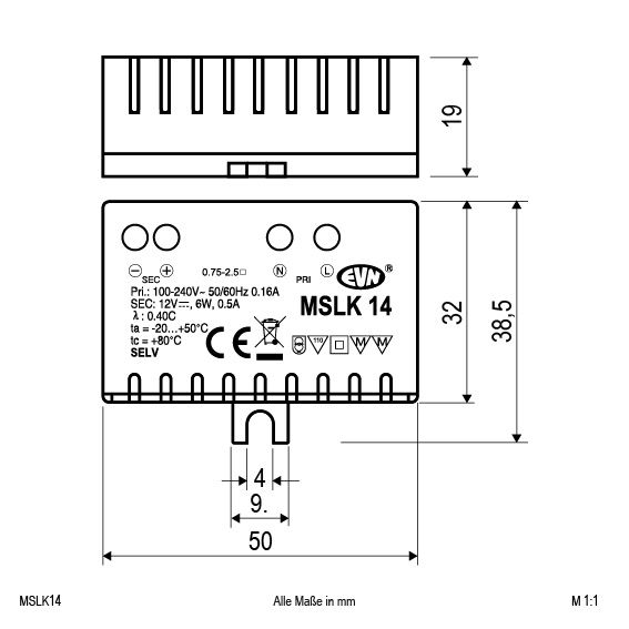 Símbolos de advertencia Fuente de alimentación 12V/DC 0,1 - 6 W 0,50A IP20