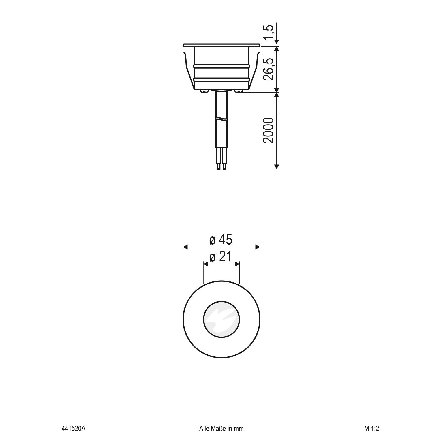 Incl. bote empotrado: luminaria LED empotrada en el suelo 441520A antideslumbrante de aluminio, 12 V/CC, blanco cálido, IP65Debido a su grado de protección IP65, la luminaria LED empotrada en el suelo 441520A está protegida contra chorros de agua y, por tanto, puede utilizarse en exteriores. Se suministra con extremos de cable abiertos para su conexión a un controlador adecuado (véanse los accesorios). Lleva integrado un módulo LED que produce una luz blanca cálida que se emite sin deslumbrar gracias a la cubierta de cristal blanco opalino. La carcasa es de aluminio y la tapa, de acero inoxidable V2A. En el volumen de suministro se incluye un bote de montaje de plástico; si se utiliza, el diámetro de montaje es de 4 cm.Características técnicas/características- Iluminación sin deslumbramiento- Distribución de la luz: simétrica- Distribución amplia: 90°- La regulación depende del controlador utilizado (véanse los accesorios)- Clase de protección IP65: protegido contra chorros de agua- Tensión: 12V/DC- Cable de conexión de 200 cm de longitud con extremos de cable libresNota: Para el funcionamiento es absolutamente necesario un controlador adecuado (véanse los accesorios).