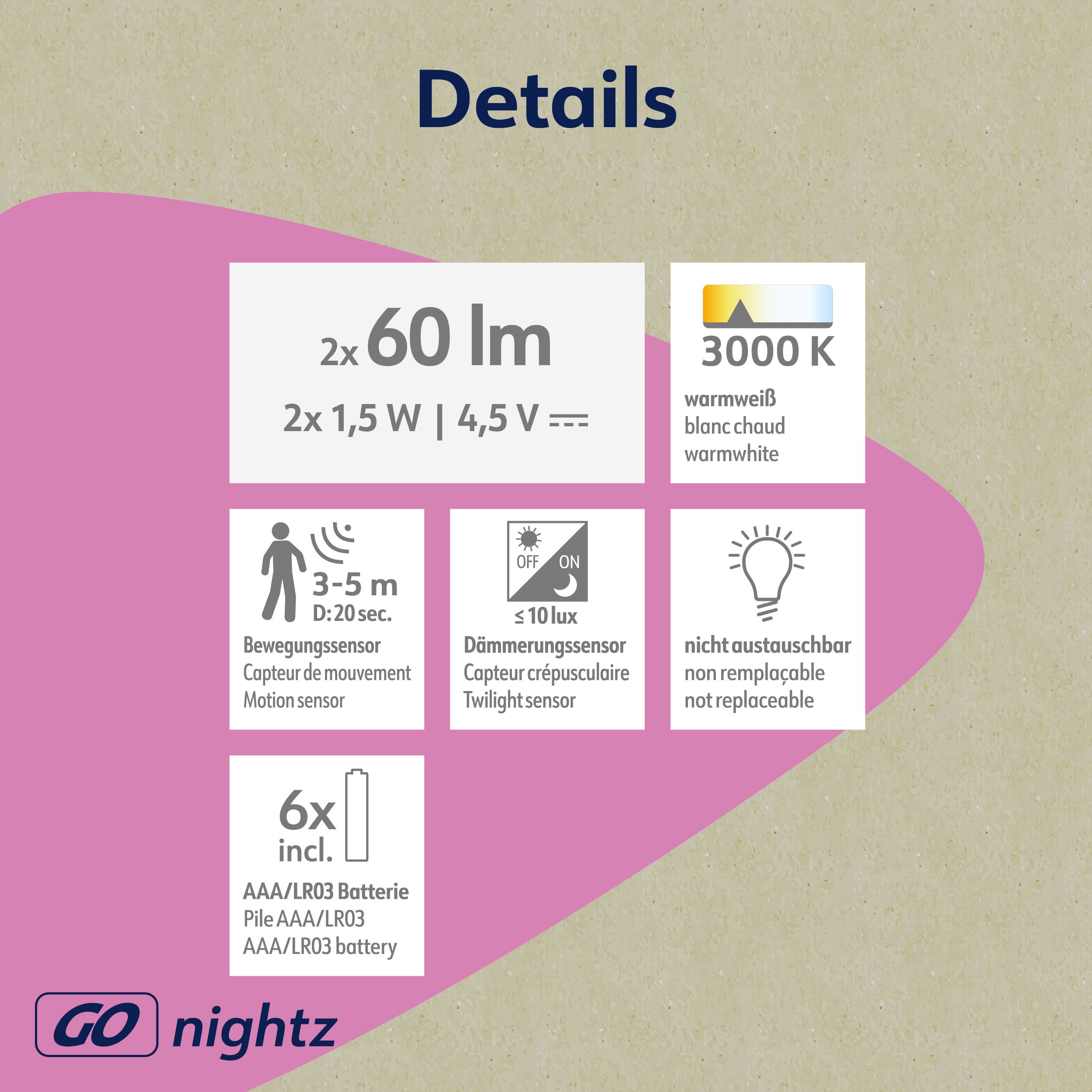 Símbolos de advertencia Lámpara nocturna LED / lámpara de mesa Nova con sensor en un paquete doble Nova es la lámpara LED perfecta en un paquete doble con sensor crepuscular y de movimiento de Müller-Licht, que hace la vida cotidiana más cómoda y segura. Esta luz versátil es ideal para dormitorios, habitaciones infantiles, pasillos y armarios y proporciona una iluminación óptima allí donde se necesita. Gracias al soporte magnético en la base, la luz se puede alinear individualmente y el haz de luz se puede dirigir exactamente donde se necesita, y la luz también se puede utilizar en movimiento. El sensor crepuscular y de movimiento enciende la luz automáticamente cuando detecta movimiento y empieza a anochecer, ahorrando energía y facilitando la vida diaria. La instalación es flexible, ya sea con la cinta adhesiva 3M suministrada para una fijación rápida y sin residuos o con tornillos y tacos para una instalación permanente.