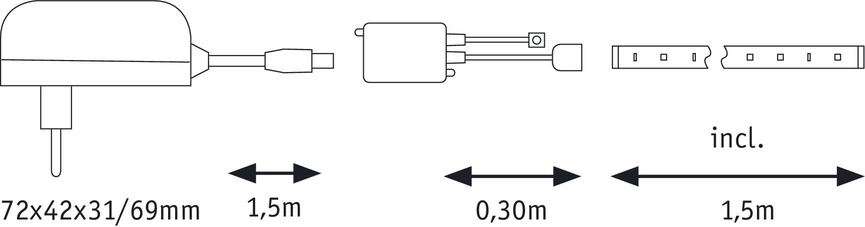 - Fuente de alimentación 230/12 V con cable y enchufe de red.