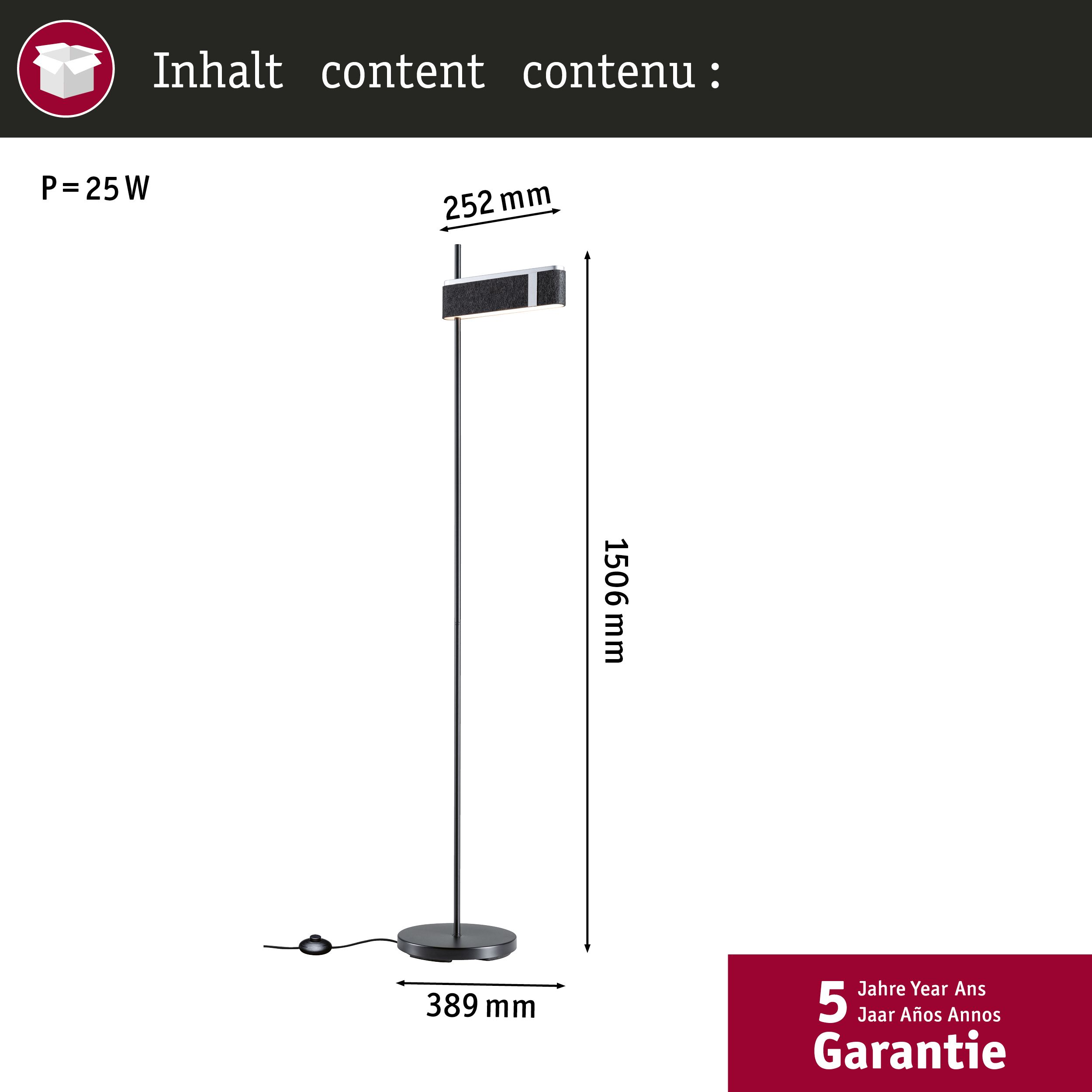 Moderna lámpara de pie LED Jagun con pantalla de fieltro en antracita y función atenuable en 3 niveles La lámpara de pie LED Jagun combina un diseño contemporáneo con una luminotecnia funcional. Una amplia pantalla se fija a la varilla vertical del armazón, que está recubierta de elementos metálicos y revestida de fieltro. Este último está fabricado con al menos un 60% de material reciclado. La luz blanco cálido del módulo LED se emite hacia abajo a través de un difusor satinado. La luz puede atenuarse en tres niveles (100 %, 50 %, 25 %) mediante el interruptor de pedal del cable, conmutando Jagun en rápida sucesión. El nivel de luminosidad activado anteriormente vuelve a estar disponible al encender de nuevo la luz (función de memoria). El material de fieltro tiene un efecto reductor del sonido y favorece así una acústica ambiental favorable.