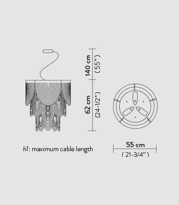 La superficie texturizada de los materiales proporciona una atractiva difusión de la luz a su alrededor. Según la orientación, los distintos elementos de la sombra refractan la luz y la dirigen en distintas direcciones. Incluso cuando está apagada, la luminaria, ligera y boyante, difunde una atmósfera de bienestar en cualquier habitación. Los diferentes estilos de decoración, incluso los más modernos, se complementan perfectamente y se iluminan eficazmente con la lámpara colgante Ceremonia. Resulta especialmente práctico el sistema magnético desarrollado por Slamp, gracias al cual la persiana puede retirarse rápida y fácilmente de la suspensión y volver a colocarse para su limpieza.