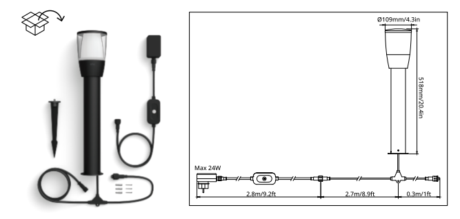 Luz LED decorativa y brillante para senderos Elpas RGBW, Master, con tecnología WiZ inteligentePara la iluminación atmosférica de espacios verdes, senderos y zonas de entrada, Elpas es una opción versátil en términos de efecto y control de la iluminación. La luminaria cilíndrica negra para caminos, fabricada en aluminio y plástico, está equipada con un cabezal más ancho. Dentro de la cubierta transparente hay un difusor interior satinado que difunde la luz ampliamente a su alrededor. Los LED integrados son regulables y el color de la luz es ajustable (de blanco cálido a blanco universal, multicolor). Gracias a la tecnología WiZ integrada, la luminaria LED para pasillos puede conectarse a un smartphone/tableta a través de WLAN y controlarse con la aplicación WiZ correspondiente. Además, también se puede manejar mediante el interruptor de pared WiZ o el mando a distancia WiZ (ver accesorios).Datos técnicos / compatibilidad:- se puede ampliar hasta un máximo de 5 luminarias por fuente de alimentación. 5 luminarias por fuente de alimentación- se puede integrar a través de WLAN; no es necesario puente ni pasarela- clase de protección: IP65- incluye pica de tierra- la luminaria maestra incluye fuente de alimentación de 230 V (IP44)- se puede complementar con luminarias de extensión adicionales de 12 V (consulte los accesorios)- se puede controlar con un smartphone o una tableta mediante la aplicación WiZ para iOS (a partir de la versión 11.0) y Android (a partir de la versión 4.4) in situ o en movimiento (se requiere conexión a Internet)- blanco cálido a blanco universal, 16 millones de colores funciones de la aplicación: conmutación directa y regulación; almacenamiento de escenas populares a través de instantáneas de la cámara; asignación de luminarias a habitaciones/grupos; creación de horarios; selección de modos/escenas de iluminación predefinidos; asignación de varios usuarios y asignación de derechos de acceso; funcionamiento de hasta 10. 000 lámparas WiZ.000 lámparas WiZ- controlable con el mando a distancia WiZ (ver accesorios)- dos funciones favoritas se pueden asignar al interruptor convencional a través de la aplicación (WiZclick)- control de voz cuando se integra con Google Home, Amazon Alexa (servicios web de Amazon suscritos durante la vida útil de la lámpara) o Apple HomeKit- Matter-certificado- integración en IFTTT para el acoplamiento con otros dispositivos inteligentes